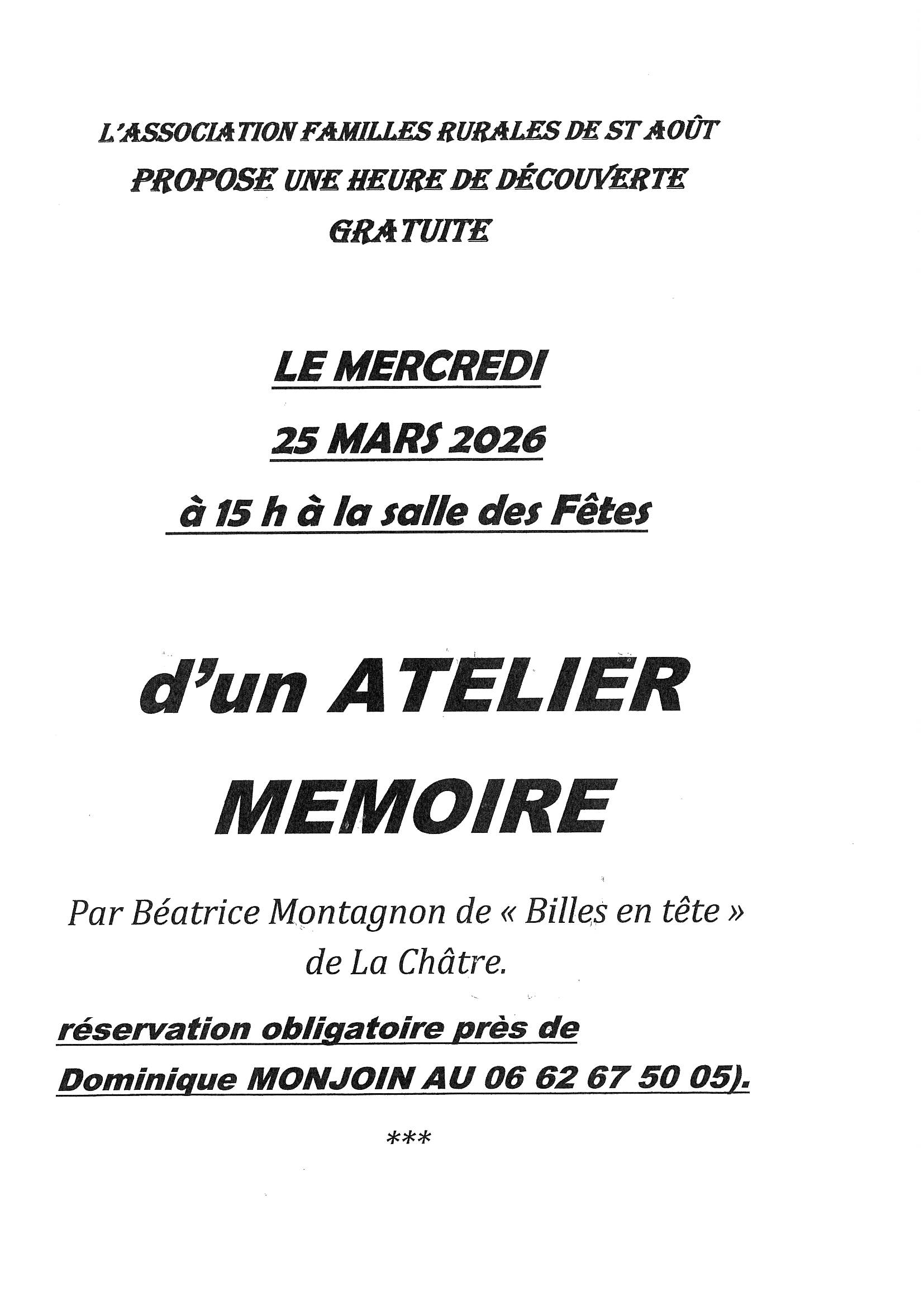 🧠✨ Atelier Mémoire à Saint-Août ! L’association Familles Rurales vous propose un atelier mémoire le mercredi 25 mars à la salle des fêtes de Saint-Août. Activité gratuite Réservation obligatoire Inscription au numéro indiqué sur l’affiche. N’hésitez pas à partager l’information autour de vous et à venir nombreux !